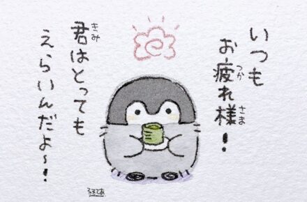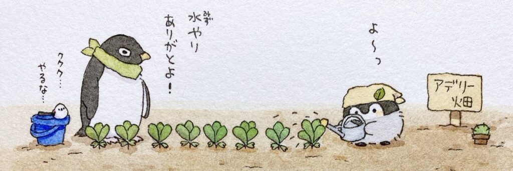 一方のコウペンちゃんは、アデリーさんに対しても変わらぬ優しさを注ぎます。「今日も元気でえらい!」「畑仕事すごい!」といった言葉をかけることで、アデリーさんの努力をきちんと認めるのです。強いキャラクターであるアデリーさんも、この無条件の肯定にどこか救われているように感じられます。