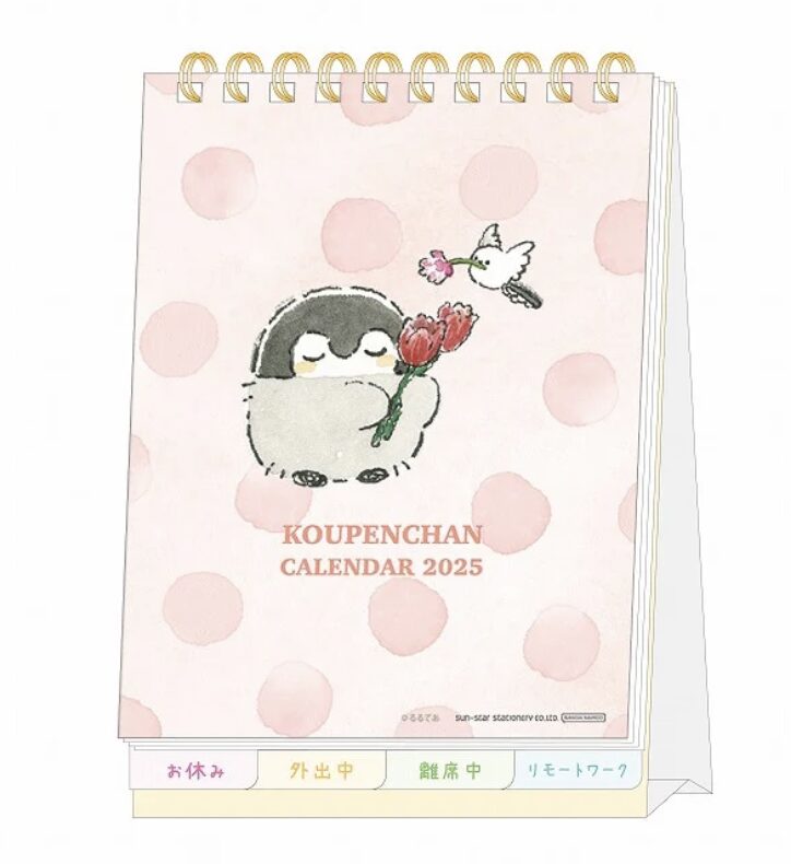 また、コウペンちゃん デスクカレンダー2026(メッセージ付)¥1,045(税込)はメッセージ付きで、お休み、外出中、離席中、リモートワークの便利なページがあり、職場のデスクに最適です。可愛さ溢れるデザインで1か月ごとにめくるのが楽しみになる仕掛けがたっぷり詰まっています。