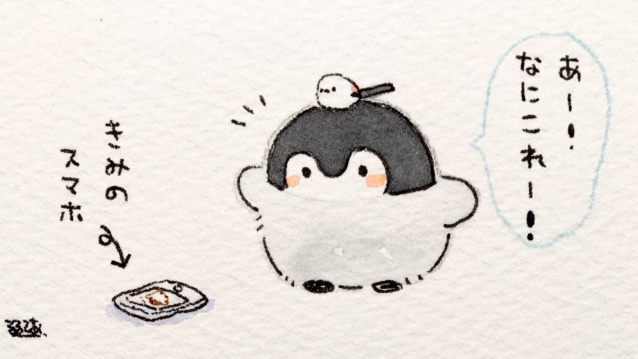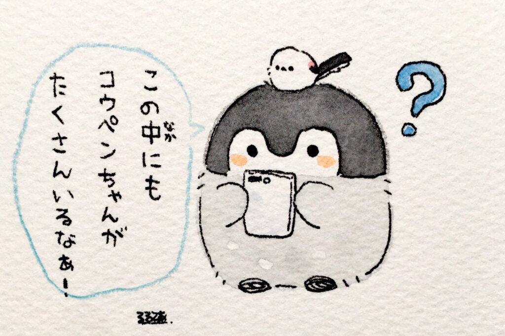 コウペンちゃん、アデリーさん、大人のペンギンさん、邪エナガさんが集合しています。落ち着いたブルーに癒されます。