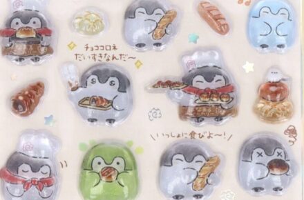 コウペンちゃん、アデリーさん、大人のペンギンさん、邪エナガさんが集合しています。落ち着いたブルーに癒されます。