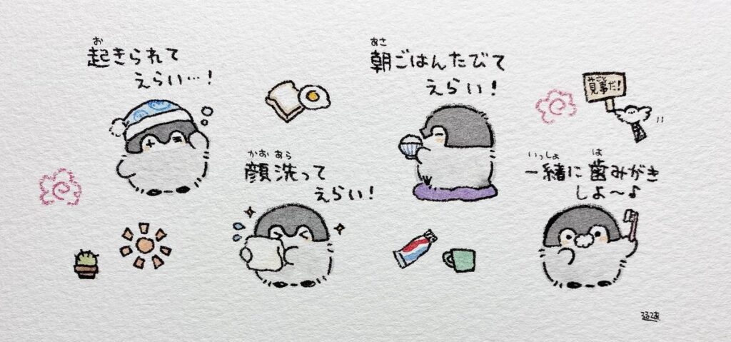 実際、SNSでは「朝コウペンちゃんを見るだけで出社できた」「疲れた心に“えらい”が沁みた」という声が多く見られます。 るるてあさんが描く柔らかなタッチと優しい言葉が、“がんばらなくてもいい朝”を許してくれるからです。 ペン活とは、そんな「がんばらない朝活」でもあるのです。